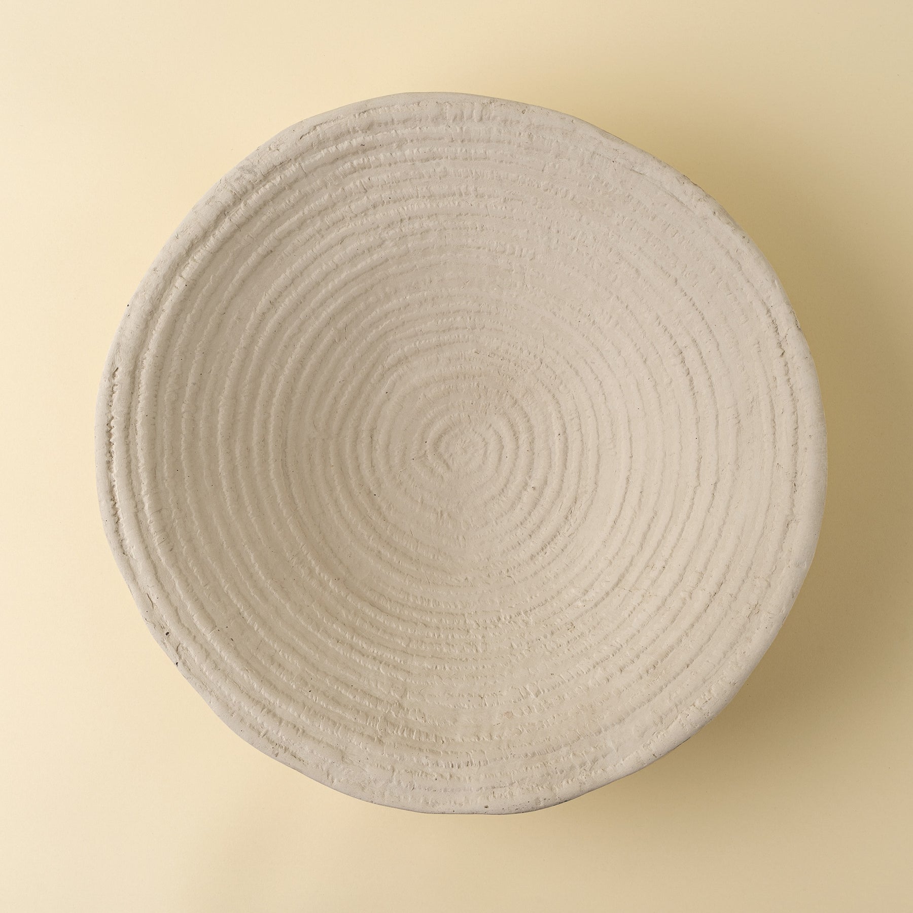 Bring quiet drama to your home with the Linnea Paper Mache Décor Bowl, a sculptural piece inspired by natural formations. Handcrafted in India using recycled newspaper and traditional crafting methods, it features a dramatic wide silhouette and horizontal concentric ridges that echo the patterns found in river stones and shells. The creamy, matte finish and textural surface offer a grounding element to your accent decor story.
