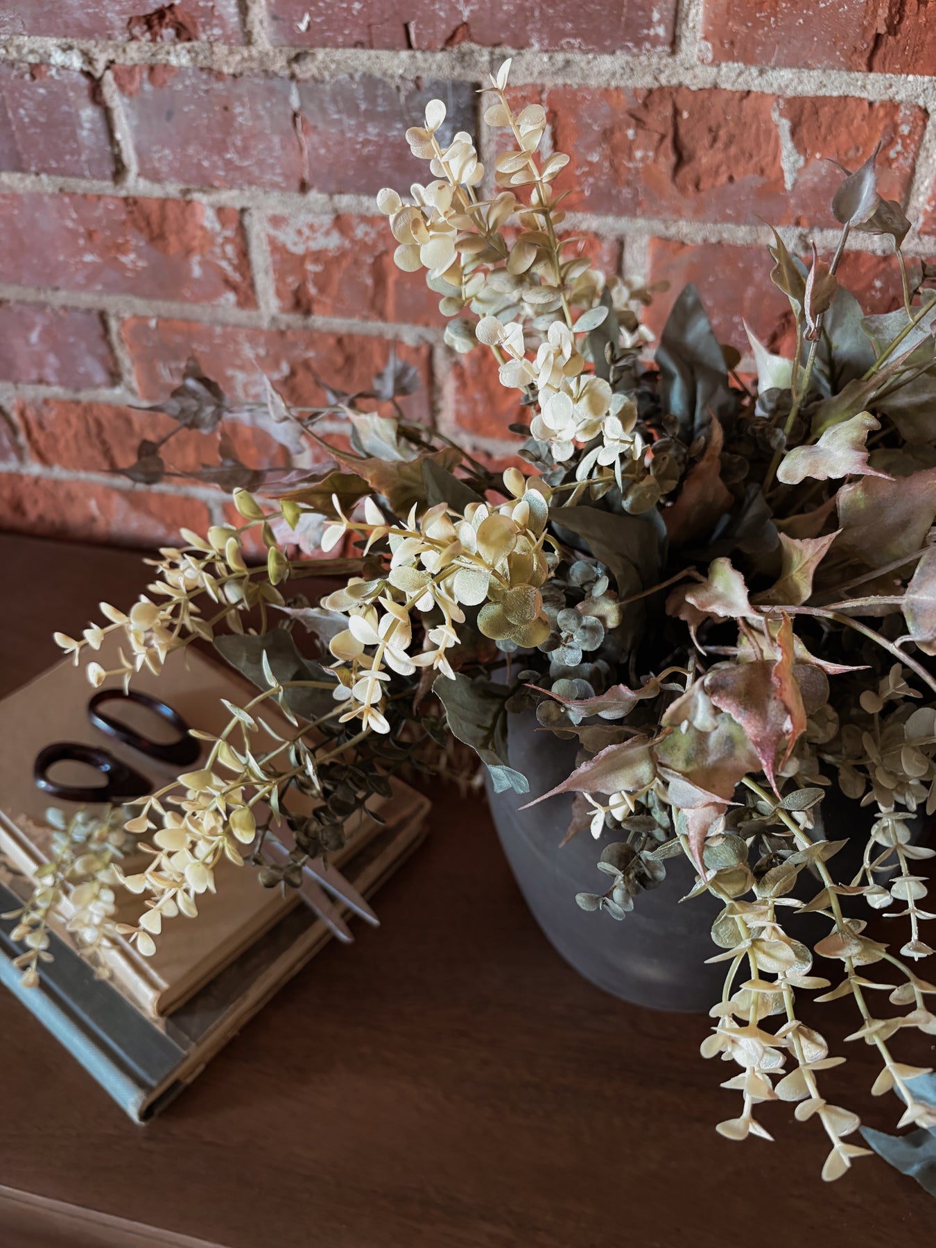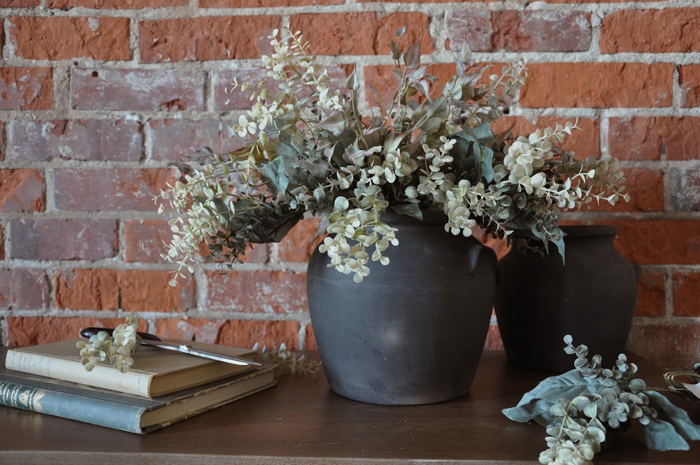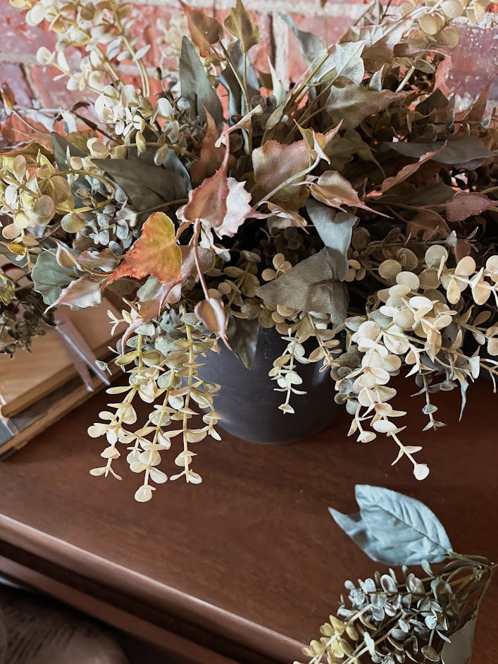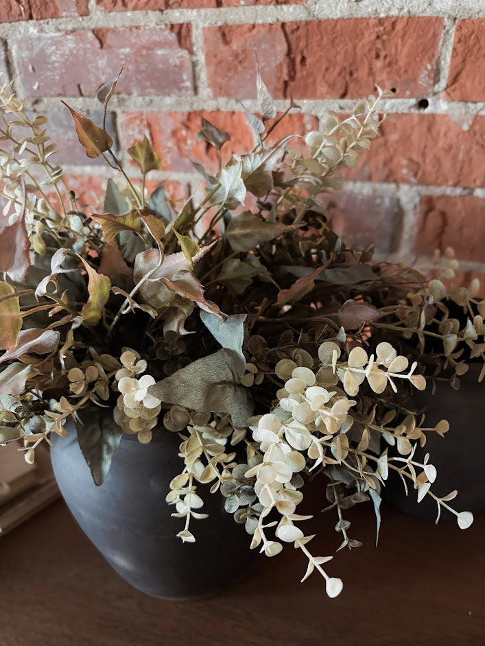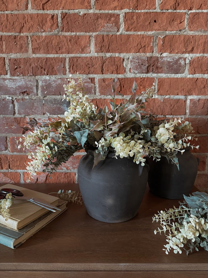 Subtle and fresh for spring. Eucalyptus and ivy in a contrasting black vase. Frances would be ideal in a kitchen bedroom or bathroom to add that fresh picked, timeless feel.