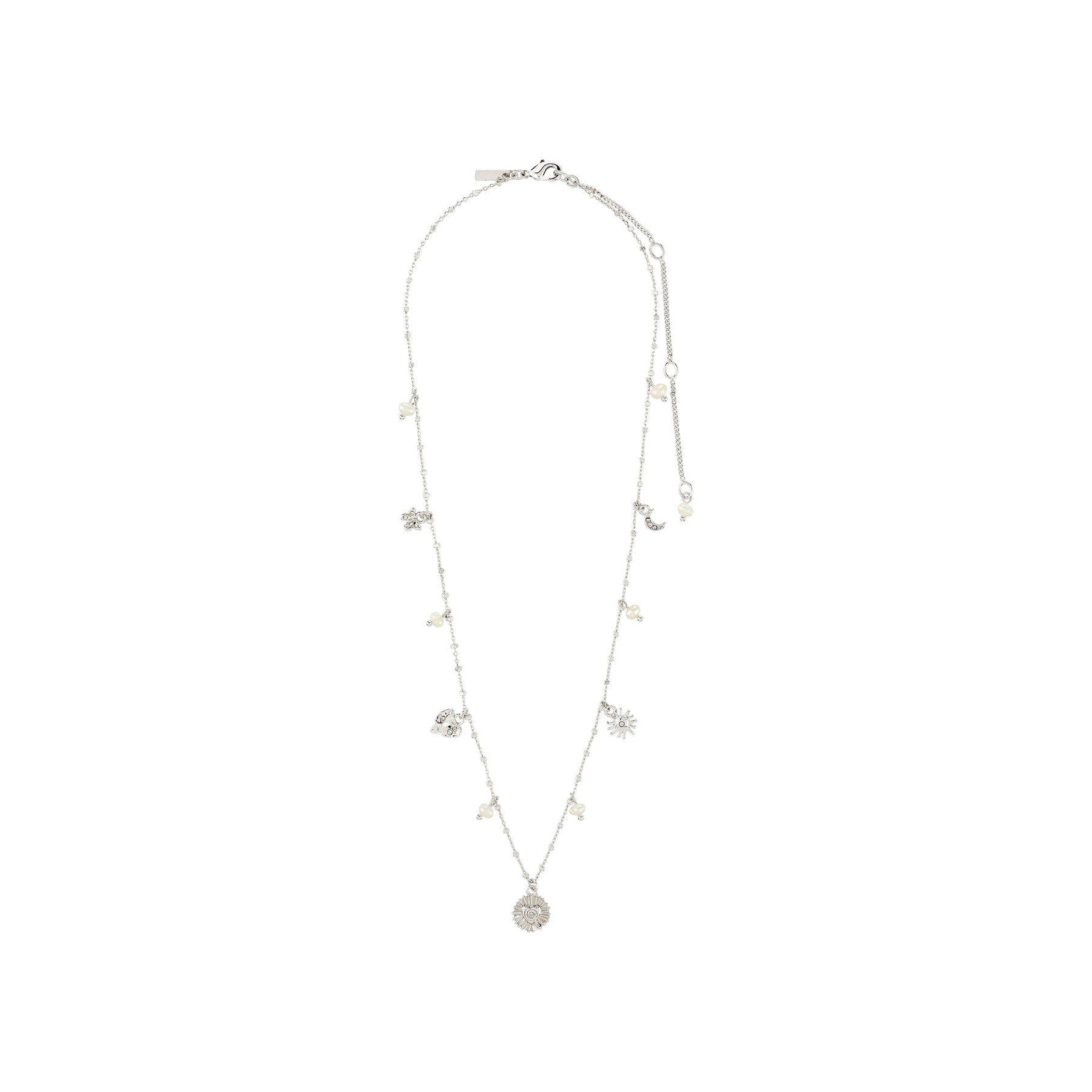 Manifest the magic! The silver-plated MYLAN necklace from Pilgrim is your new everyday amulet—loaded with symbolic charms like the sun, moon, and heart that sparkle with high-vibe energy and a touch of mystical glow. Pearls and intricate pendants bring a whimsical vibe and a sense of spirited storytelling to this piece. Wear it solo as a statement of soul, or stack it up with other chains for that dreamy, curated look. The necklace measures 38 cm with an extra 9 cm extender chain and is crafted from 93% recycled materials—good karma included.
