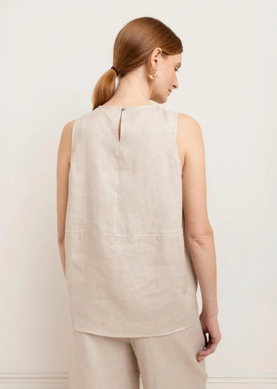 Your warm-weather essential. The Aubrey Tank is crafted from 100% linen—naturally breathable, effortlessly lightweight, and made to keep you cool from spring through late summer. It features a clean high neckline and a sleeveless silhouette for a polished, minimal look that still feels relaxed.