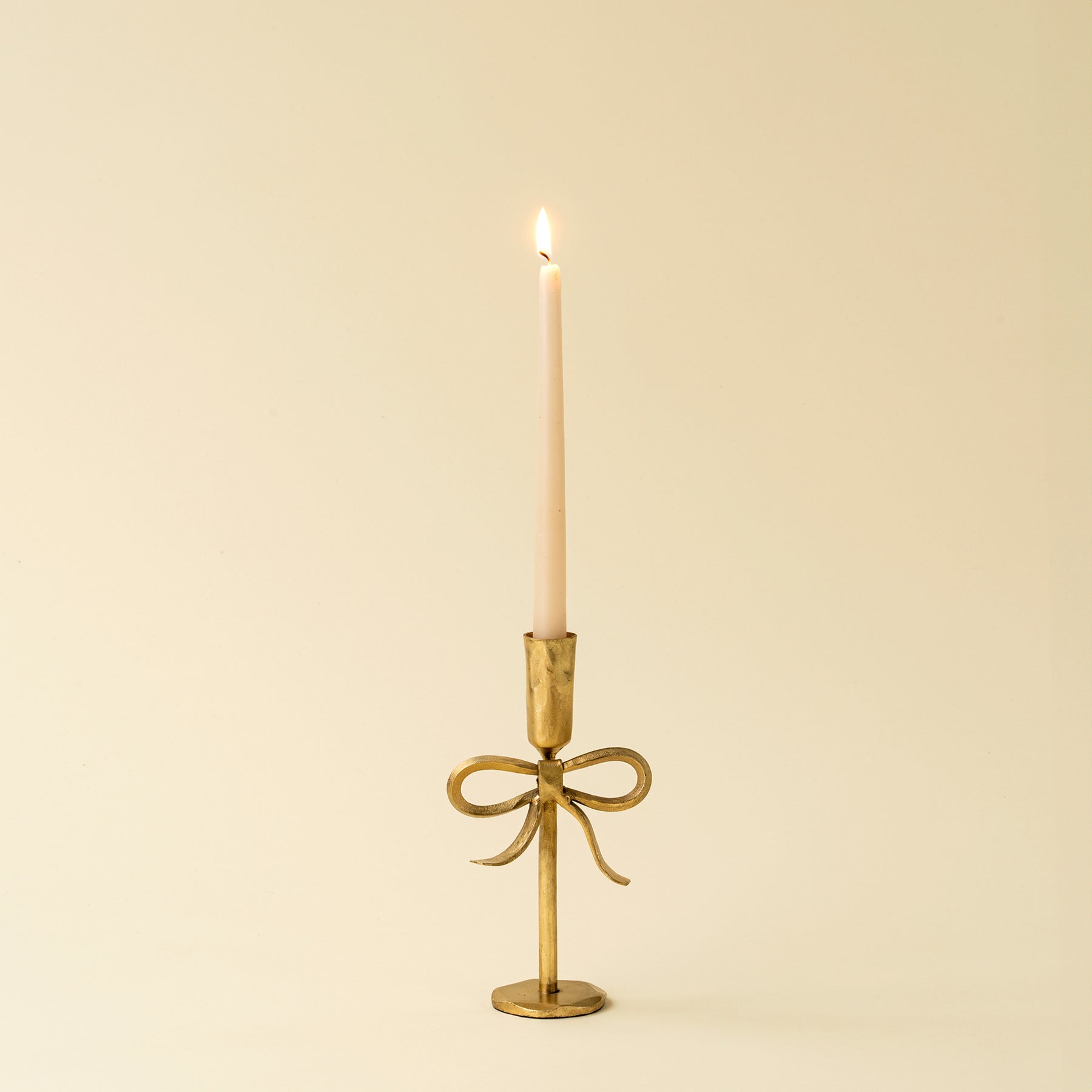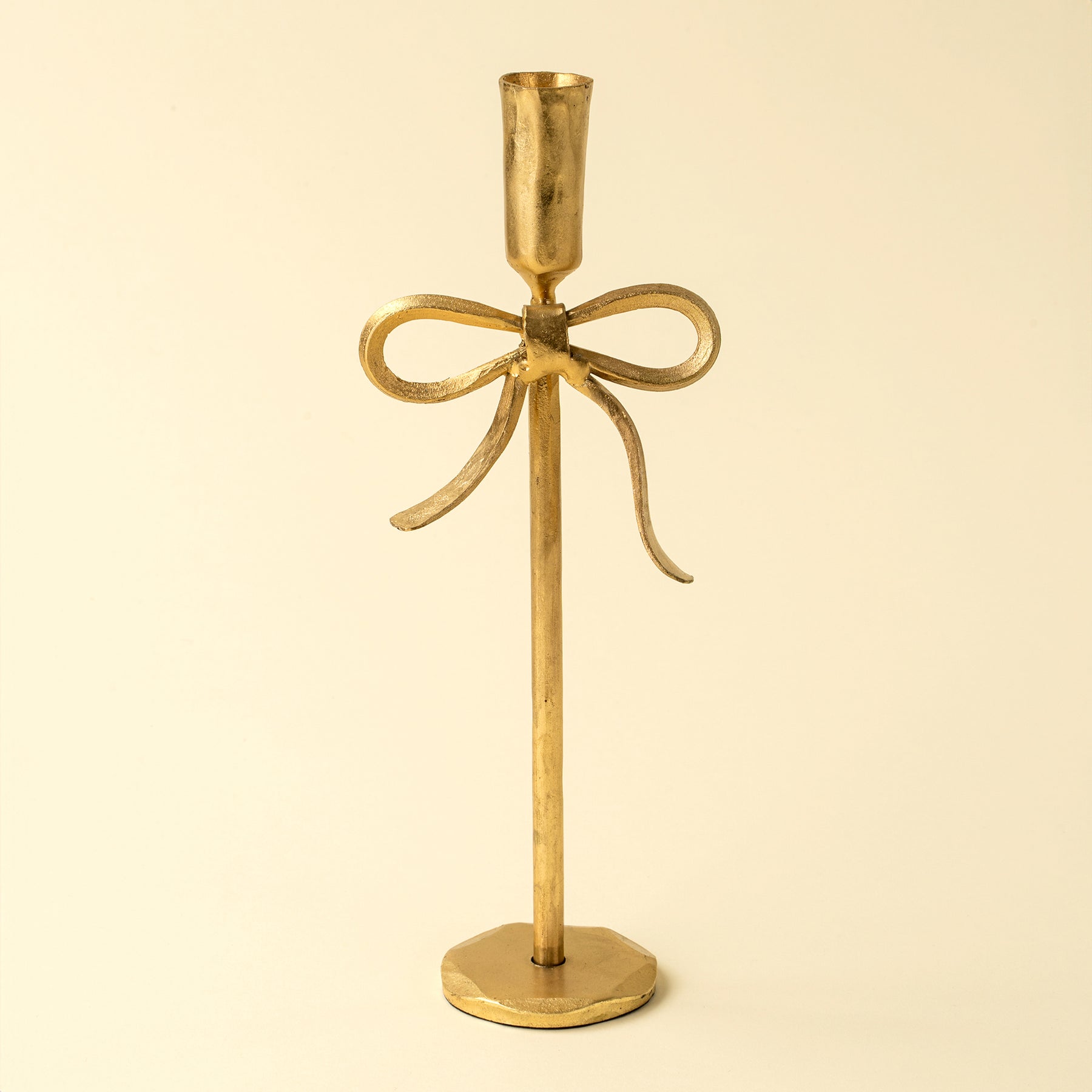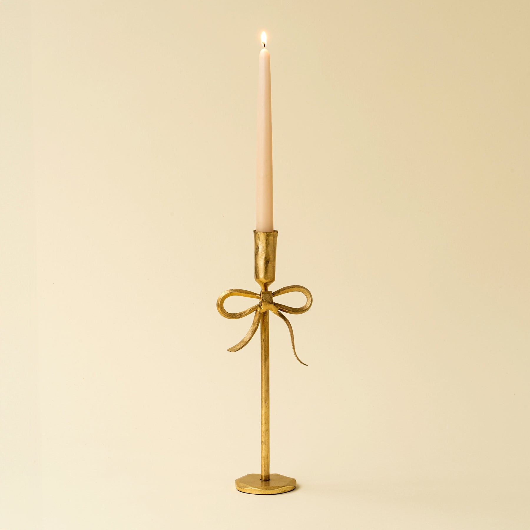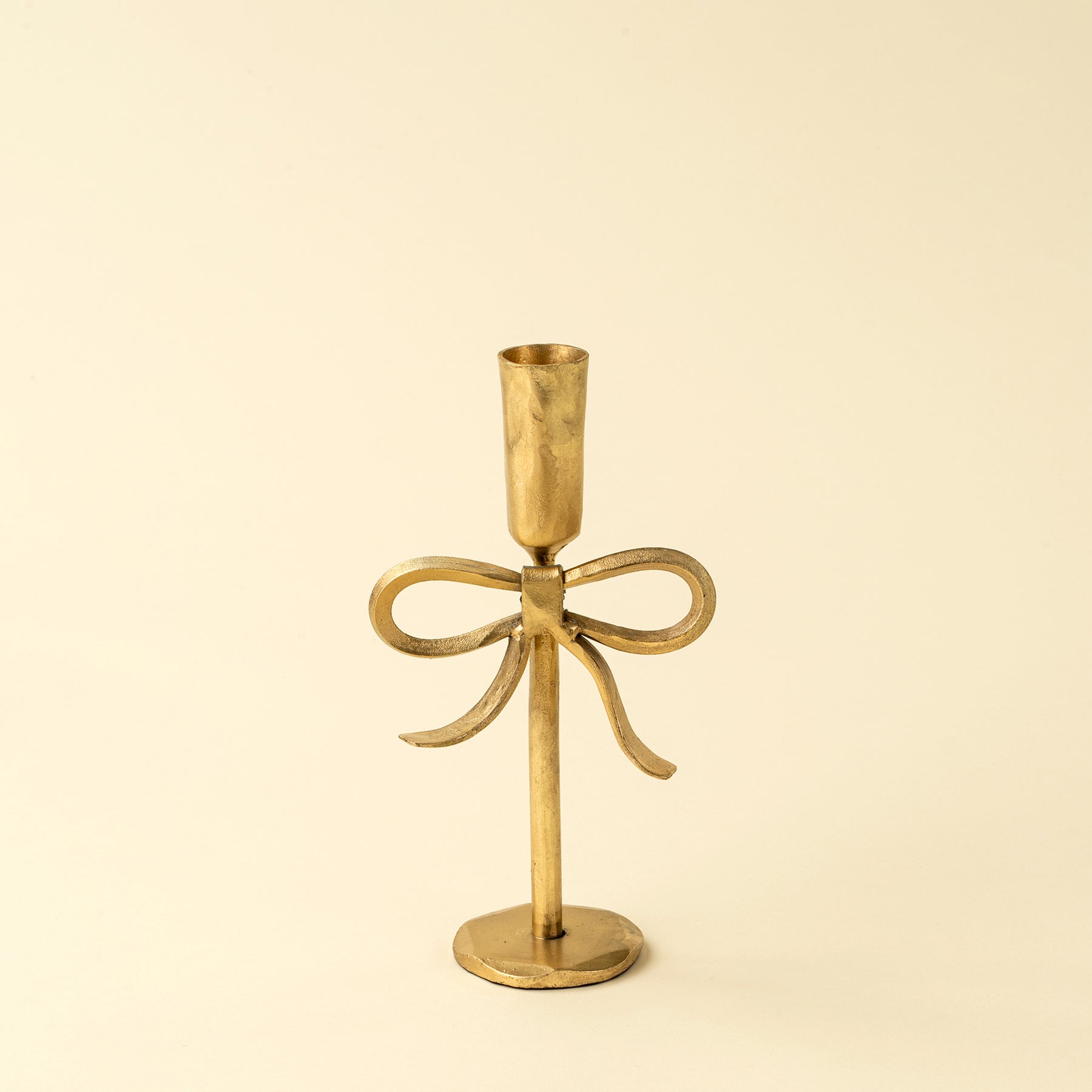 Add a touch of charm to your accent decor with the Bow Forged Candlestick in Gold. Made in Moradabad, India, a city celebrated for its traditional metalwork, this delicate candle holder features a hand-forged bow that feels both romantic and refined. Its petite scale is perfect for styling on side tables, mantels, or as part of a layered tablescape. Finished in warm gold, it pairs beautifully with taper candles to create a soft, inviting glow.