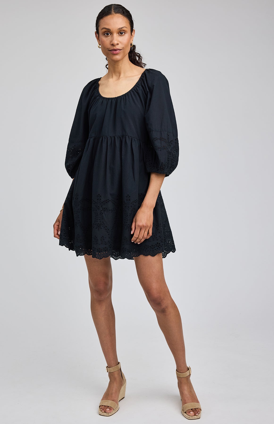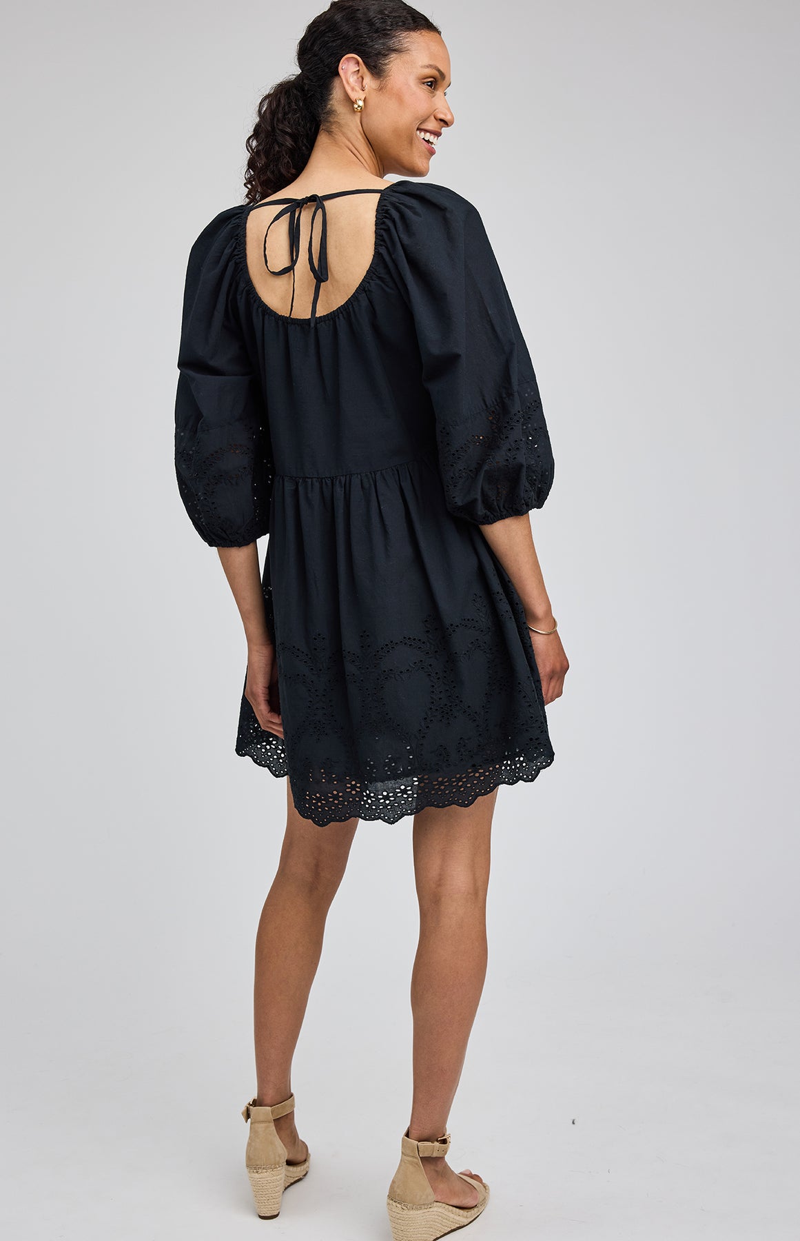 The Coralina dress is made of a cotton fabric with an embroidered eyelet design. Features include a back tie detail and body lining for ease of wear.
