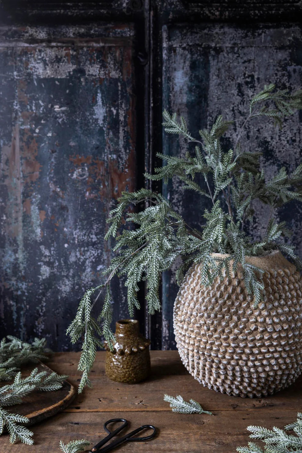 The perfect stem to take you into the cooler months, our Artificial Pine Branch, Frost is certainly not lacking in texture. Stunning with wintery white stems and contrasting silhouettes, this beautiful faux foliage will be an instant classic in your seasonal botanicals.