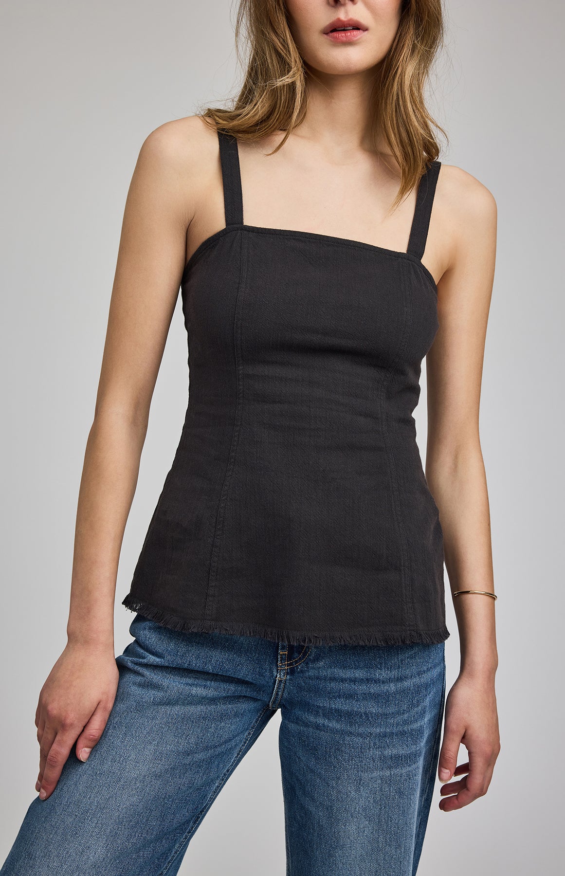 The Inez top is made of a textured cotton twill that has been specially washed for a soft feel. Features include adjustable straps, fringe hem detail, and a back smocking panel for ease of wear.