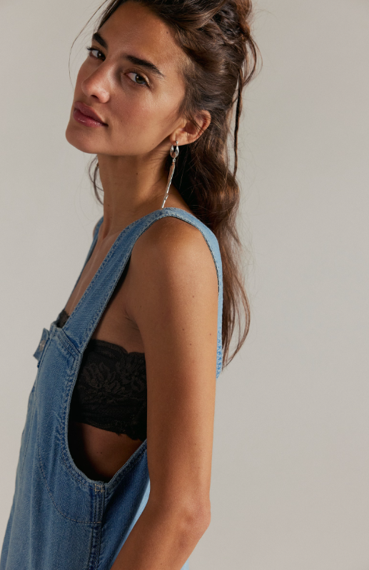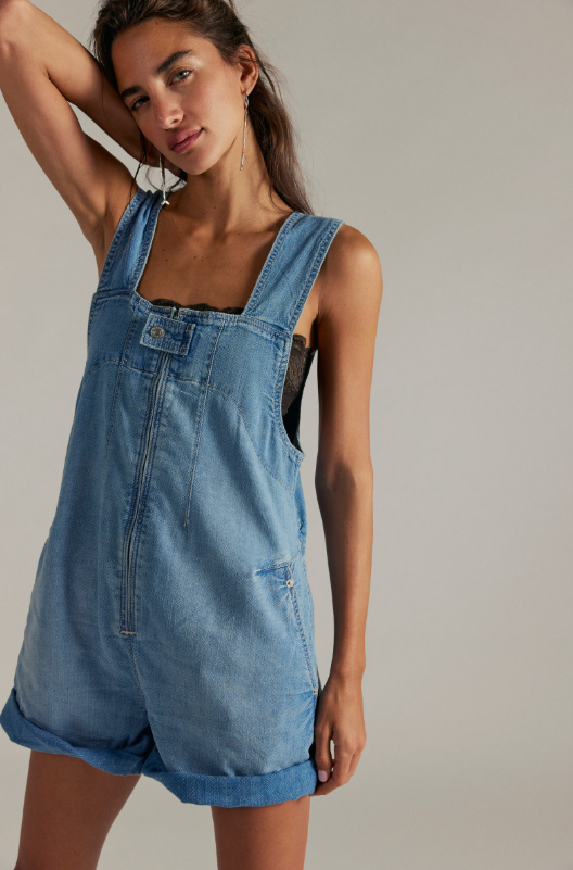 Your easiest instant outfit, this denim shortall features a slouchy, shapeless silhouette and classic pinafore design for a timeless touch.