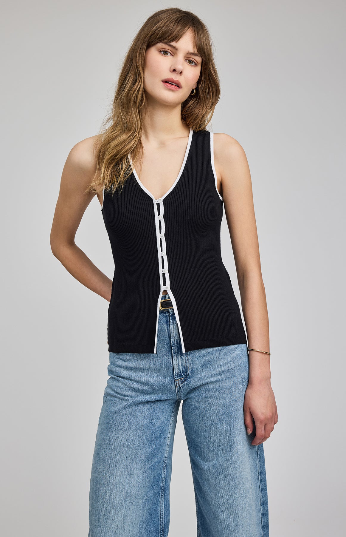 The Miles tank is made of a soft yarn in a rib knit pattern. Features include a v-neckline and functional button closure.