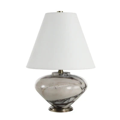 The Monumento table lamp pairs natural beauty with understated elegance. Its grey marble base with subtle veining and dark antique brushed brass-plated accents create a sophisticated look. A soft ivory linen tapered shade casts a welcoming glow, while the in-line fine-tuning switch allows for adjustable light making this lamp perfect for adding warmth and style to any modern or transitional interior.