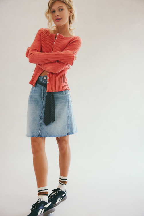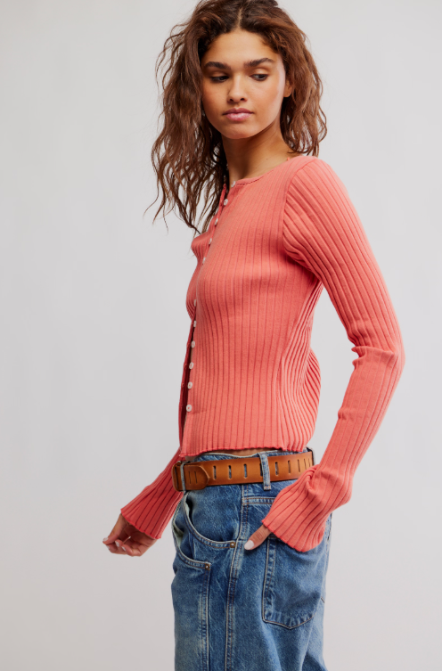 • Stretchy ribbed knit fabrication, scoop-neckline, button closures, fitted long-sleeves