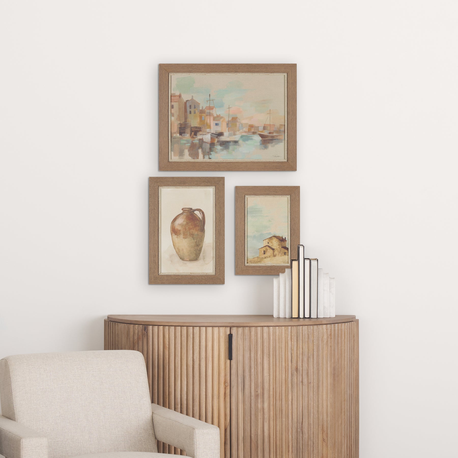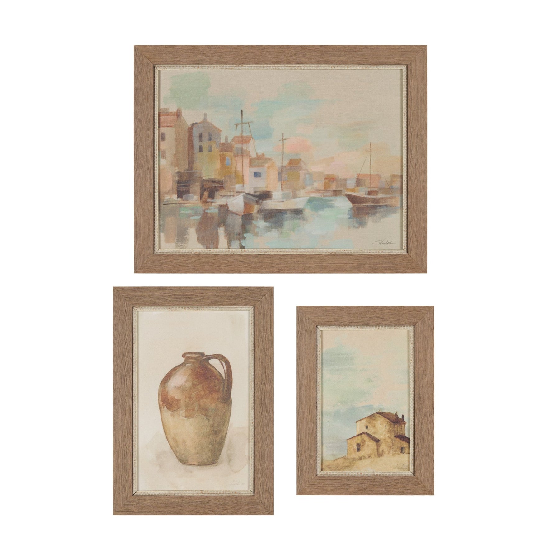 Tuscan Collection by Silvia Vassileva is a captivating trio of framed art prints, each hand-embellished to evoke the essence of timeless charm. The collection showcases a tranquil harbor scene bathed in soft pastels, an elegantly crafted rustic jug, and a serene countryside dwelling set against a gentle sky. Executed with delicate watercolor hues, these pieces feature subtle textures that invite you to explore the harmonious intersection of nature and artistry.