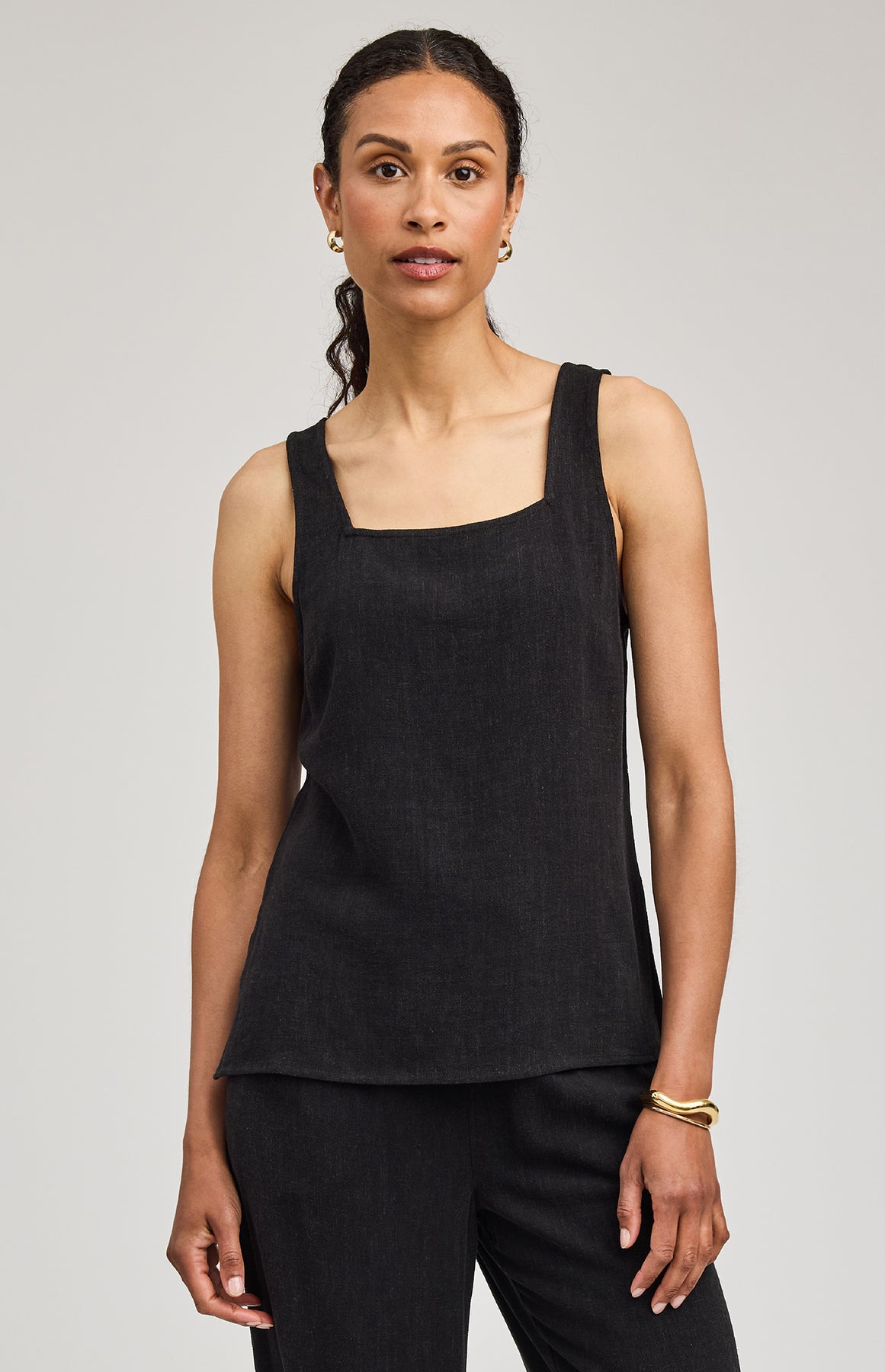 The Vera tank is made of a linen blend fabric for an effortless look and feel. Features include a square neckline and side slits. Complete the look with the Alma short or Finley pant.