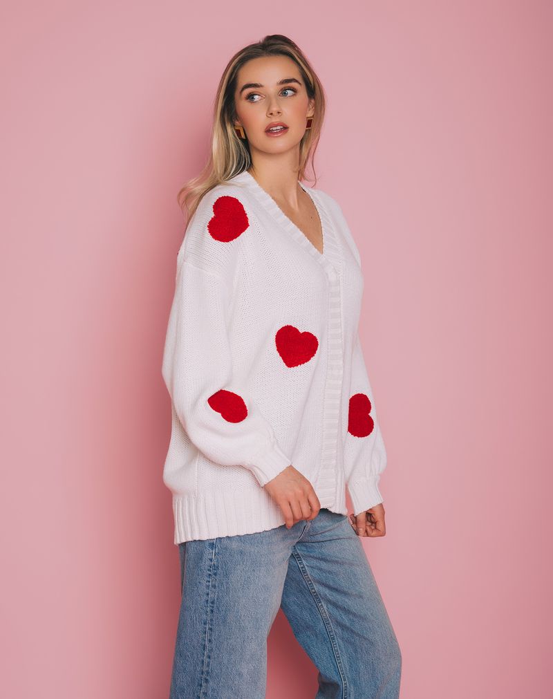 This oversized cardigan features a dropped shoulder, ribbed hems, and hidden snap closures. It’s slightly longer, hitting at the upper thigh for the perfect amount of bum coverage. With its all-over heart design, it’s seriously the cutest piece to add a touch of love and comfort to any look.